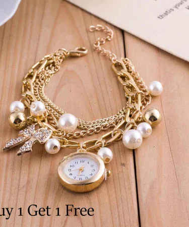 Gold Multi-layered Crystal Stone Pearls Watch For Women (Buy1Get1 Free)