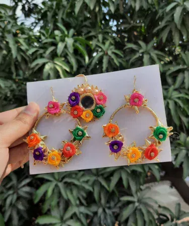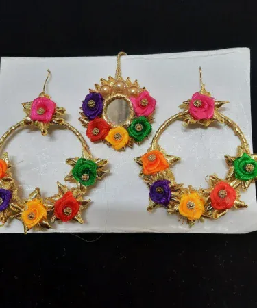 mehndi jewelry sets available – earrings and matha teeka – mayun mehndi earrings and matha teeka – mayun mehndi set – mehndi wear – mayun wear – dholki accessories for bride – bridal wear – formal wear – fashion jewelry -mehndi earrings – matha teeka