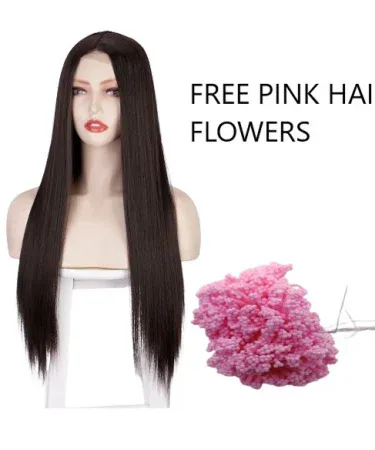 Full head wig for girls & women’s natural Black color – WITH FREE PINK HAIR FLOWER