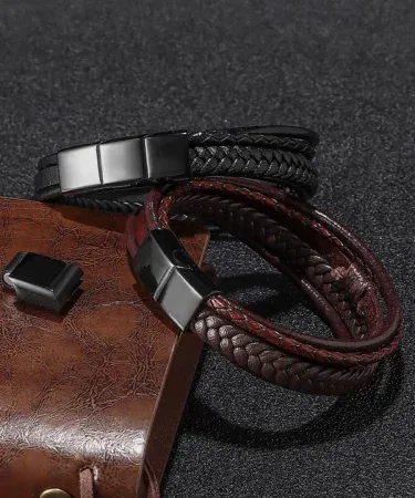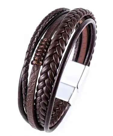Stainless Steel Braided Leather Bracelet for Men Cuff Bangle Cross Magnetic Clasp 8.26 inches