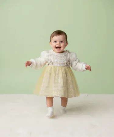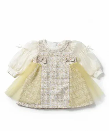 Elegant Yellow Tweed Baby Girl Dress with Puff Sleeves & Tulle Layer,Adorable Baby Girl’s Party Dress with Tulle Skirt, Elegant Pastel Tweed and Tulle Baby Dress for Special Occasions , Premium and imorted quality