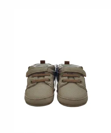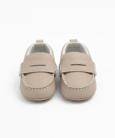 Infant Soft Sole Moccasin-Style Crib Shoes (Clear and highlights the specific look) Baby Hook-and-Loop Closure Loafer Booties (Focuses on the easy fastening) Neutral Tan Faux Leather Moccasins with Contrast Stitching (Mentions color, material, and detai