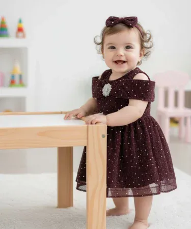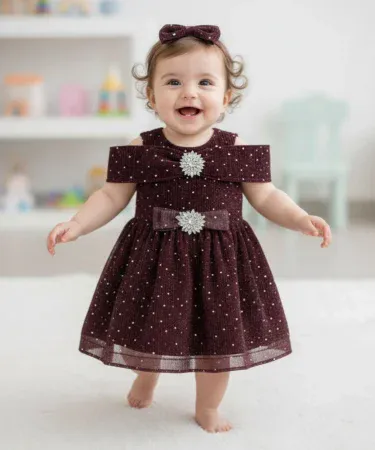 Sparkle Bow Party Dress, Burgundy Off-Shoulder Dress, Jewel Detail Glitter Dress, Maroon shining frock for baby girls, Premium and imported quality