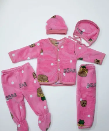 Newborn 5-Piece Plush Bear Print Footed Pants, Shirt, Hat & Bib Set