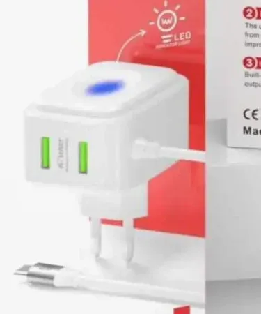 GLC Dual USB Fast Charger (3.4A) Android & iPhone Compatible Travel Friendly Adaptive Fast Charging |1% CHARGING IN 1 MINUTE| fast charger, dual usb charger, android iphone charger, 3.4A output, GLC charger, travel charger, metal cable charger, mobile